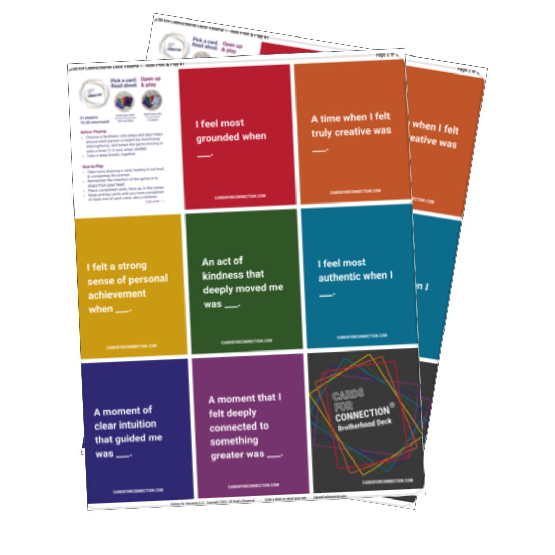This 55-card printable deck was created to support honest, emotionally rich conversations between men, brothers, fathers, friends, and mentors.
