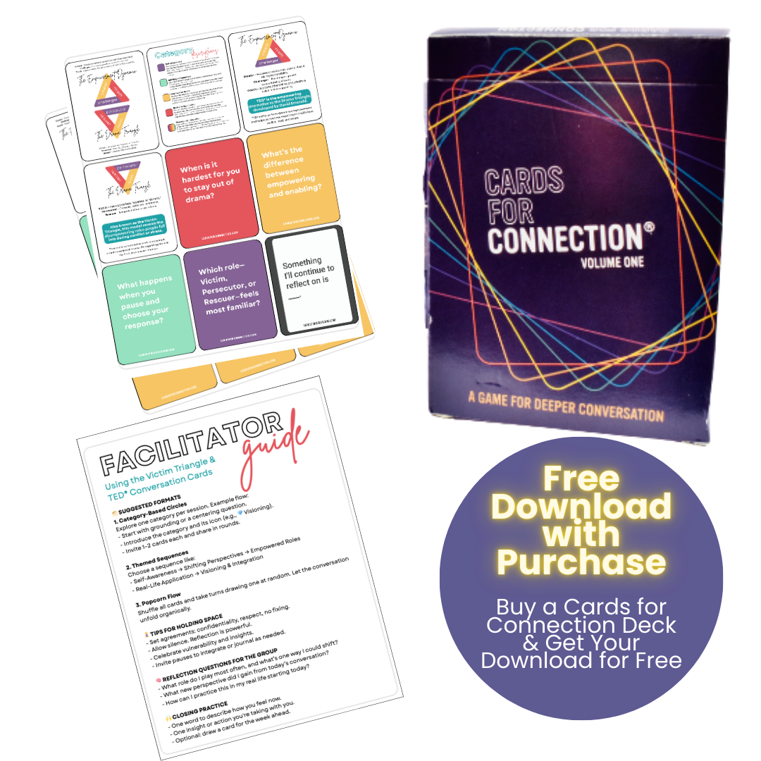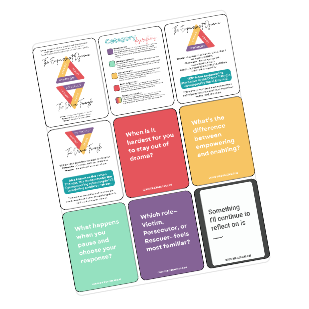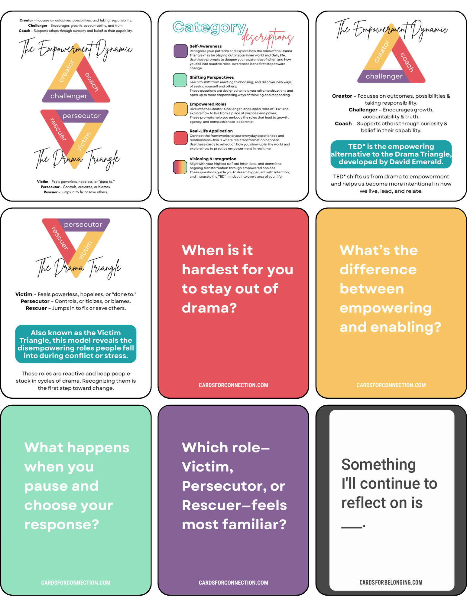 The Cards for Empowerment deck is a printable toolkit for people ready to move from survival roles to conscious leadership, creativity, and connection. Whether you're journaling solo or facilitating a group, these 55 reflection cards help you shift from the Drama Triangle to the Empowerment Dynamic—one prompt at a time.
