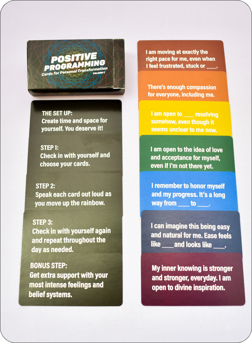 The Positive Programming Deck uses a seven-color emotional arc that guides you from naming the hard stuff to reconnecting with clarity and intention.