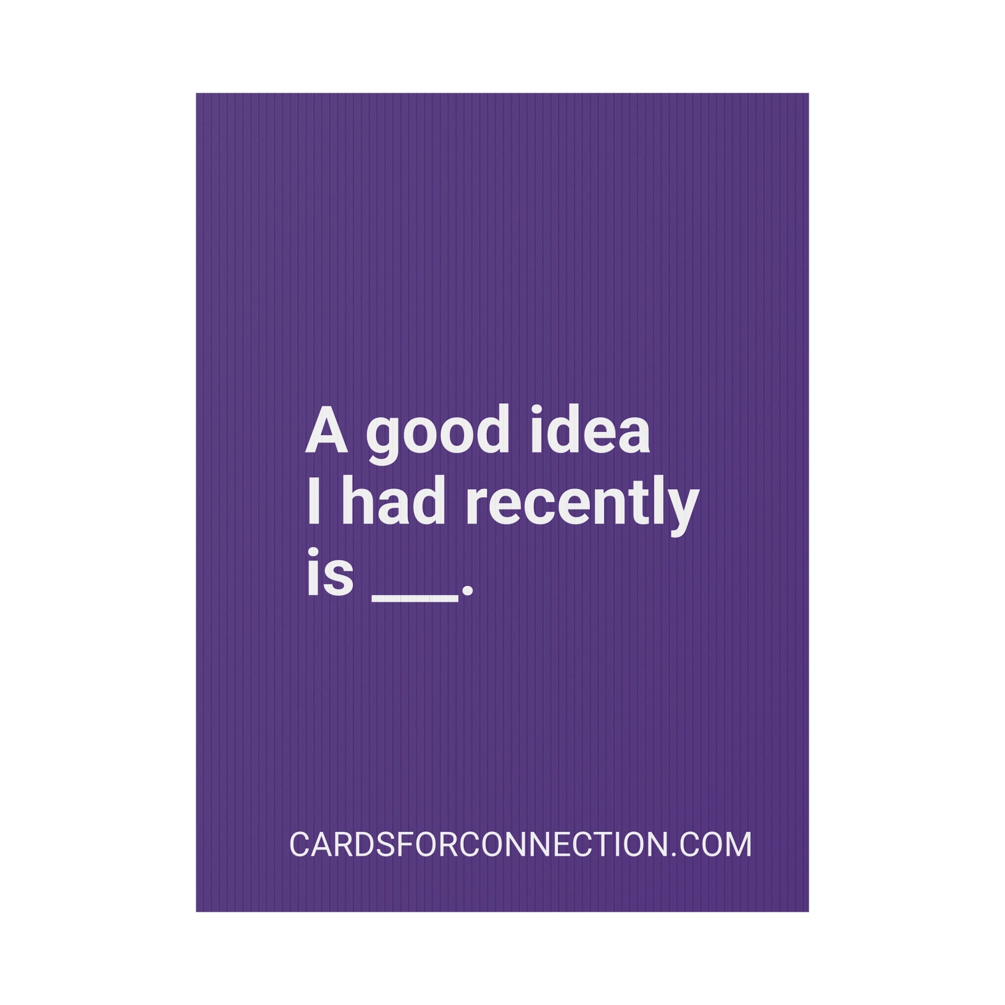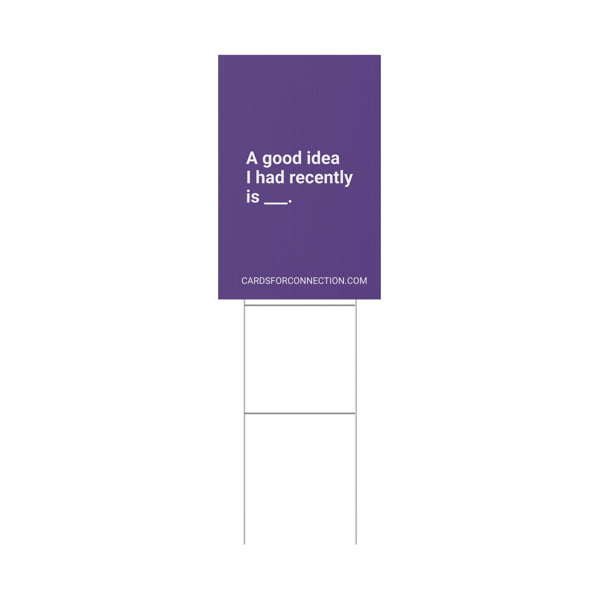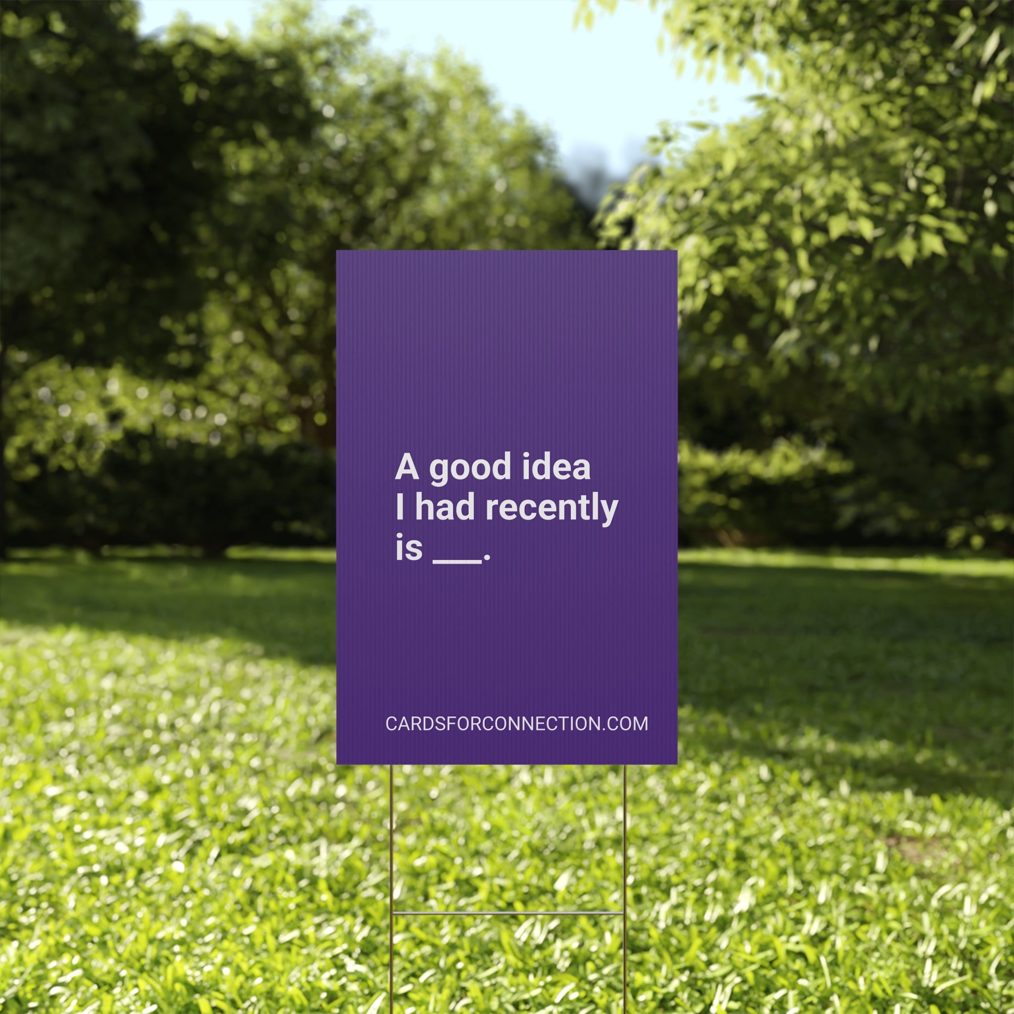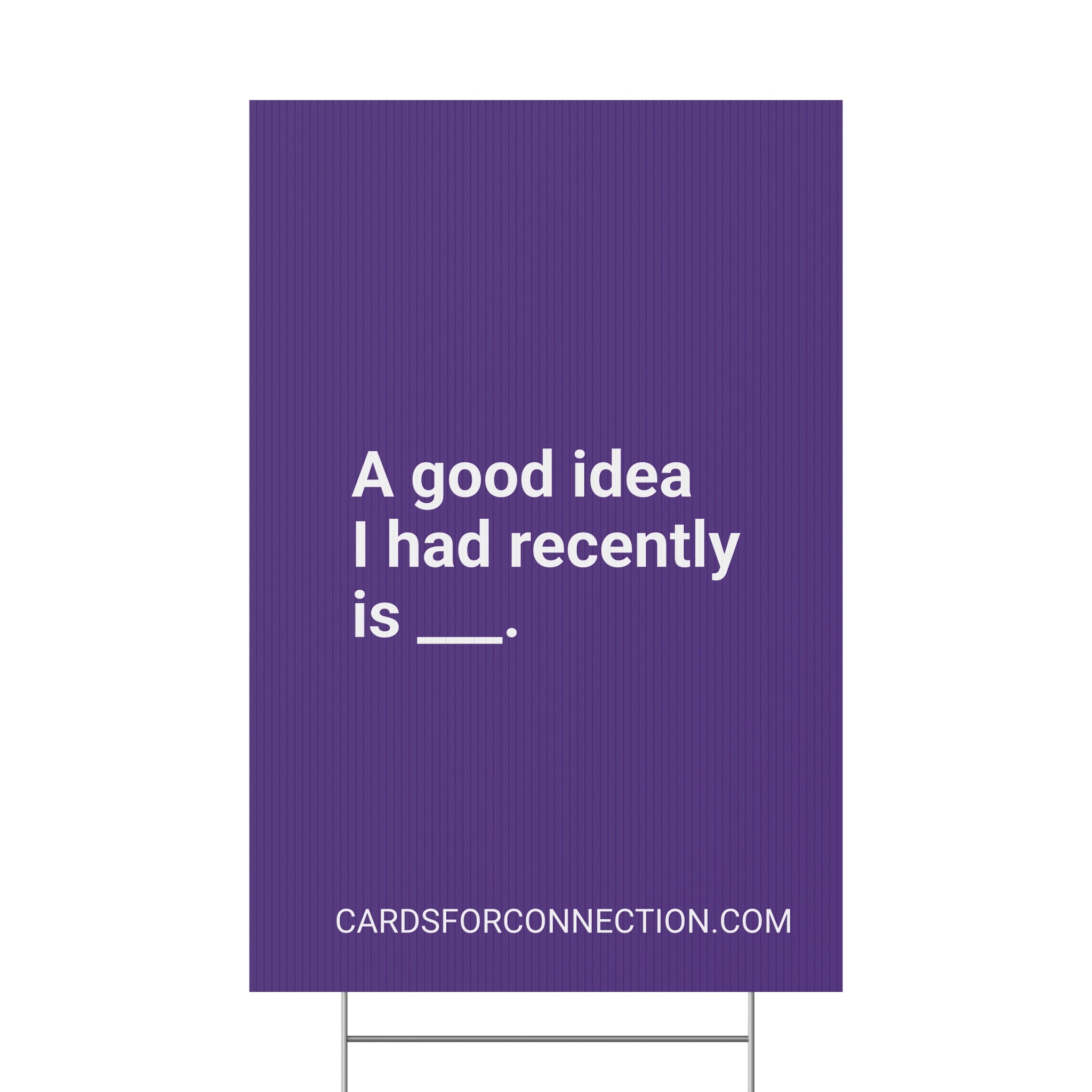 Purple sign with white text 'A good idea I had recently is ___.' and a website URL at the bottom.